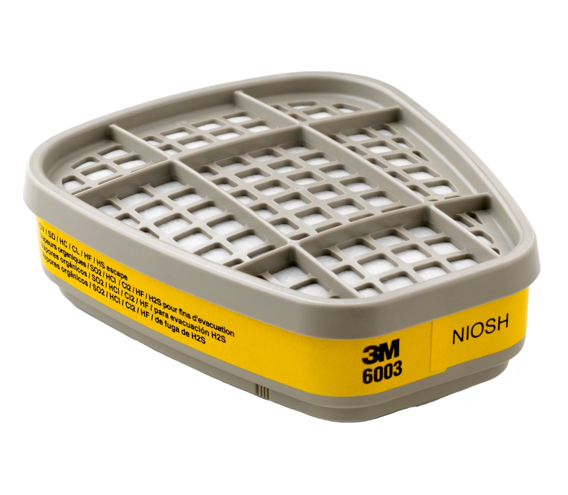 Brinda protección respiratoria contra ciertos vapores orgánicos o gases ácidos. Aprobado por NIOSH contra no mas de 500 p.p.m de vapores orgánicos, 5p.p.m. de cloro, 25 p.p.m. de cloruro de hidrogeno y 25 p.p.m. de dióxido de azufre. Se usa con los respiradores de media cara y cara completa 3M con soporte de filtro de bayoneta.
